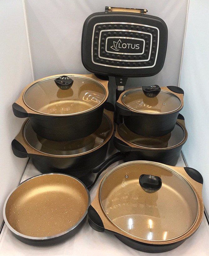 سرویس 13 پارچه گرانیت لوتوس ، شامل قابلمه های سایز 20، 24، 28، 32 می باشد . از ویژگی های بارز این سرویس تابه دو طرفه موجود در سرویس می باشد که به طبخ غذایی سالم تر کمک میکند.