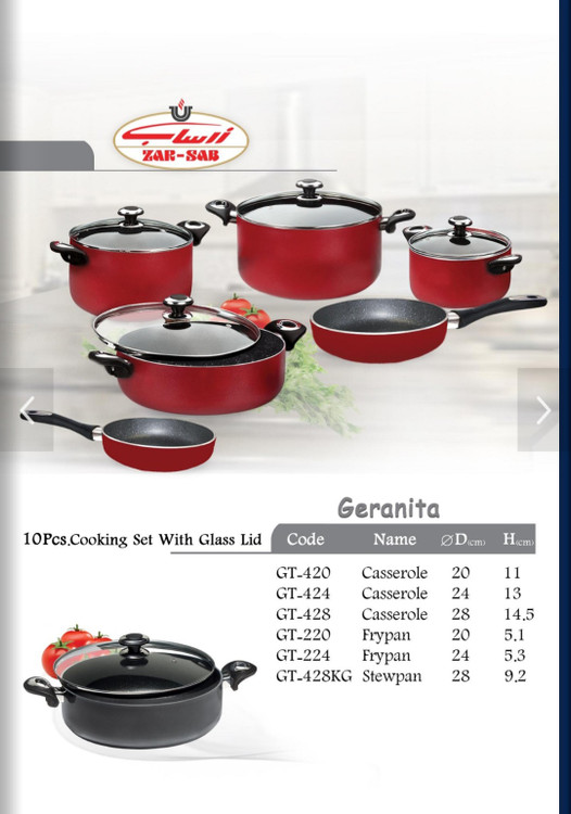 سرویس 10 پارچه گرانیتا زرسابتابه سایز 20 گرانیتا زرساب کد GT-220, تابه سایز 24 گرانیتا زرساب کد GT-224, قابلمه سایز 20 گرانیتا با درب شیشه ای زرساب کد GT-420, قابلمه سایز 24 گرانیتا با درب شیشه ای زرساب کد GT-424, قابلمه سایز 28 گرانیتا با درب شیشه ای زرساب کد GT-428, قابلمه کوتاه سایز 28 گرانیتا با درب شیشه ای زرساب کد GT-428KG
