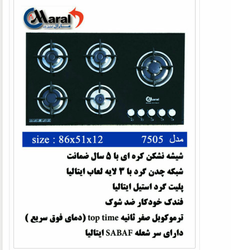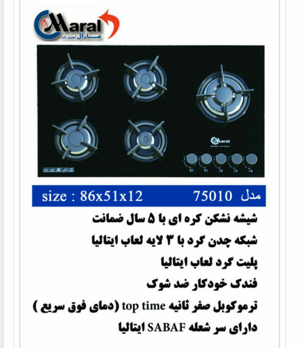 اجاق گاز رومیزی ۵شعله(پیرکس)مارال استیل مدل۷۵۰۳۰ناموجود
